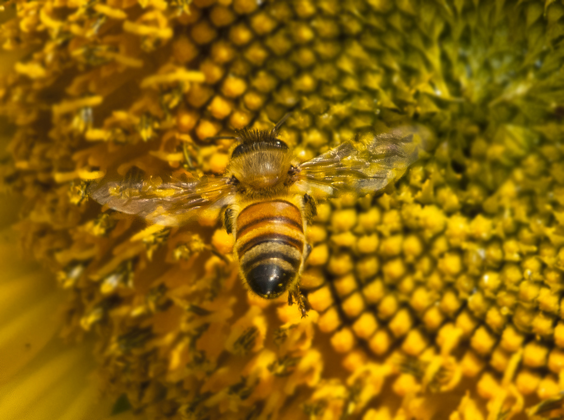 Excellent shot on this. It is very difficult to get such perfect focus on a fast moving insect. Unless you somehow staged this. I'm assuming it is an actual action shot, in which case it is amazing. I gave it an 8 because it is a little difficult to see the bee because it is so close to the color of the sunflower and the composition is just average, but the detail and focus are truly amazing.