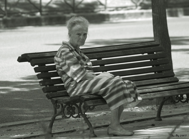 Nice shot! I too like the pattern on her dress and how it flows with the bench slats. I am very curious as to her expression though. Did you happen to ask her if you could take her picture? It's hard to tell if that's a smile or a snear. Irregardless, the shot has captured my attention, enough to write a comment, and in general that can be a hard thing to do.