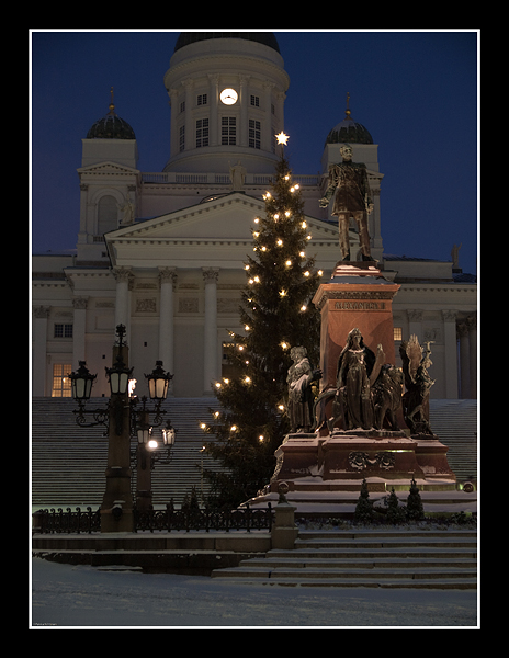 Sun rises at 09:15 so itīs still fairly dark in the morning when I hurry to work through the center of Helsinki. For those unfamiliar with Helsinki the bronze statue in photograph was erected for the Grand Duke of Finland Alexander II on the second half of the 19th century.