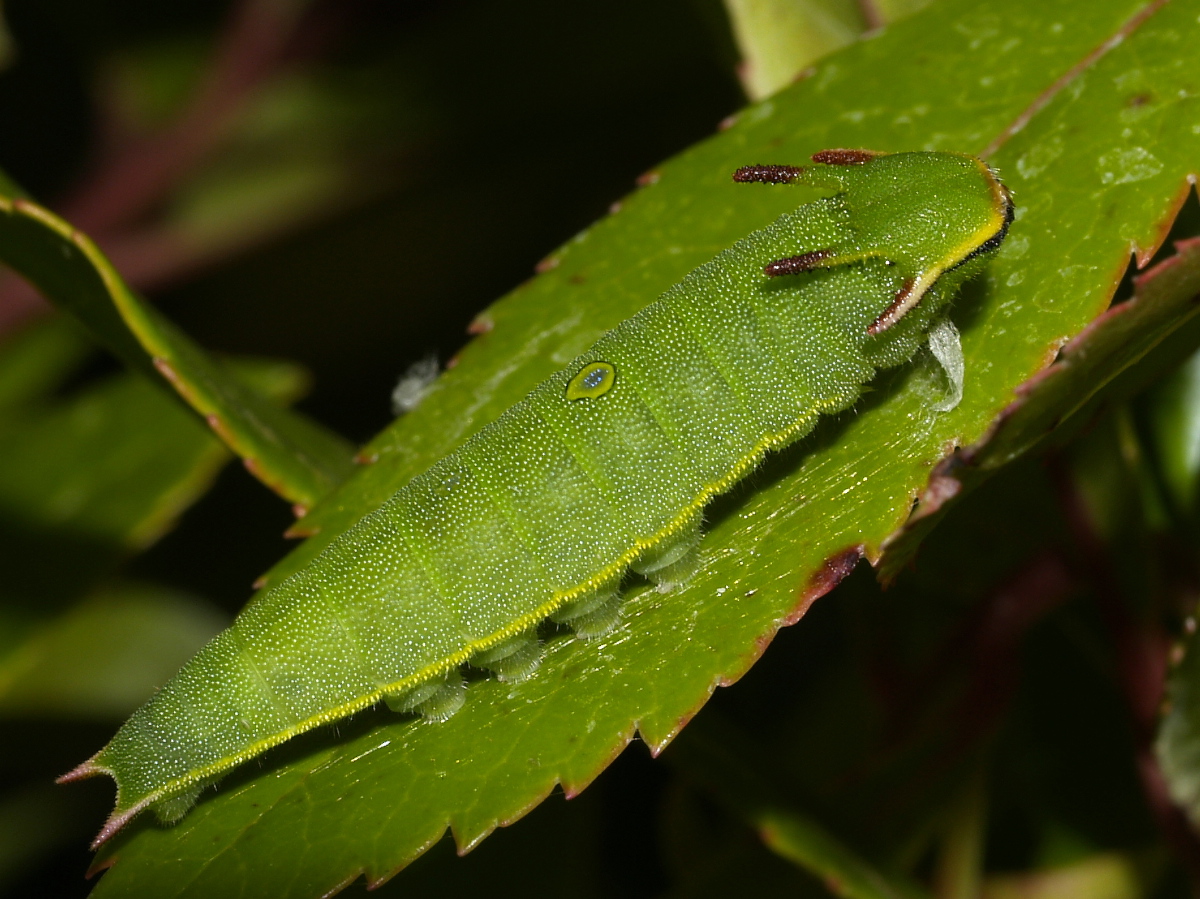 Twee weken later een rupsje. Nu, na 4 -5 weken is ie een dikke 6 cm lang. Omdat ik hem nu goed warm houd gaat de groei vrij snel. Overdag 26gr- 'snachts 19-20gr.