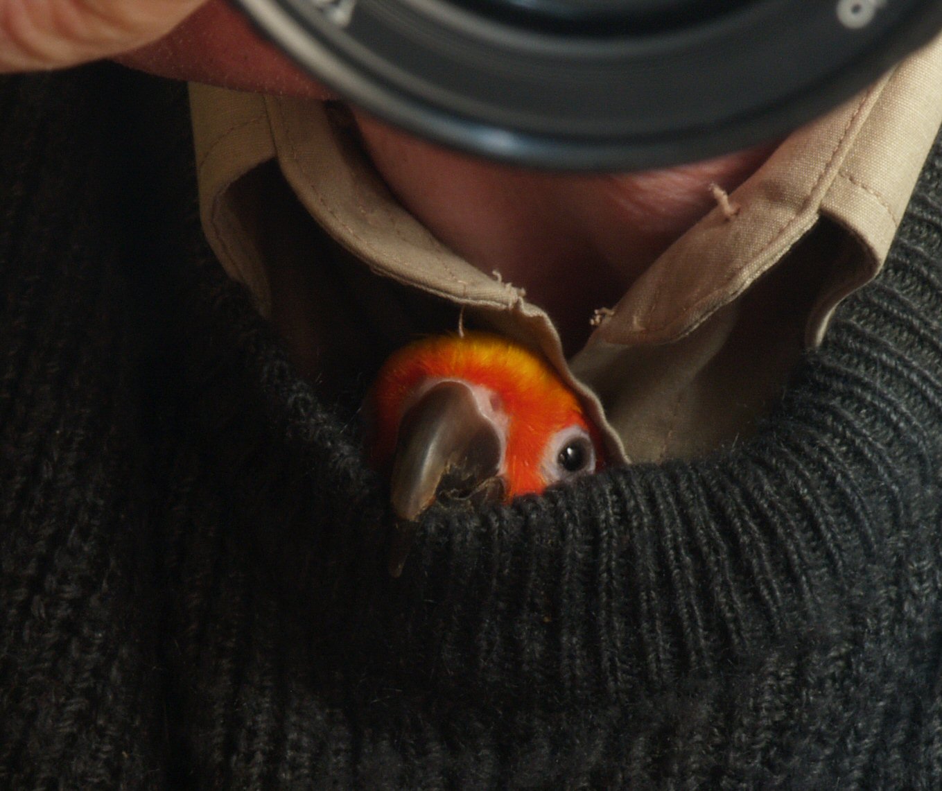 What a nice shot Dave. Our Green Cheeked Conure also likes to do that, particularly up sleeves! She also likes to take naps with my wife as in http://myolympus.org/document.php?id=5424