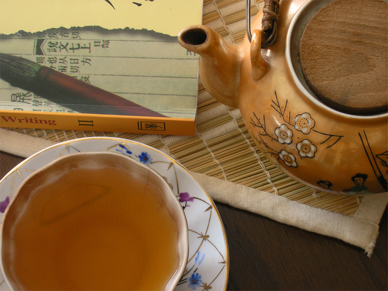 Japanese teapot, Indian tea, Russian Lomonosov porcelain cup and a Chinese text book - afternoon tea.