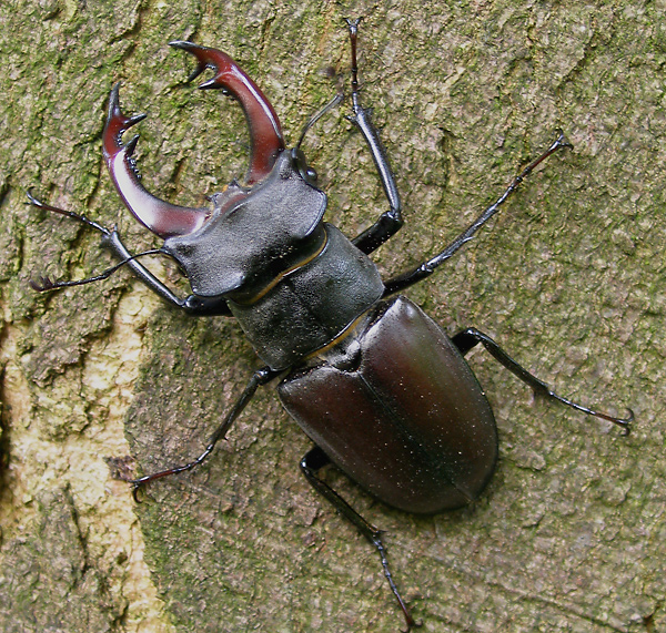 A stag beetle on a tree, in Lobau. These interesting insects became very rare. In Lobau (Vienna), there used to be a lot of them more than ten years ago - this is the first one i have seen since 15 years! They only live 4 to 6 weeks in the beetle-state, while the whole lifetime is about 5 to 8 years as larva.