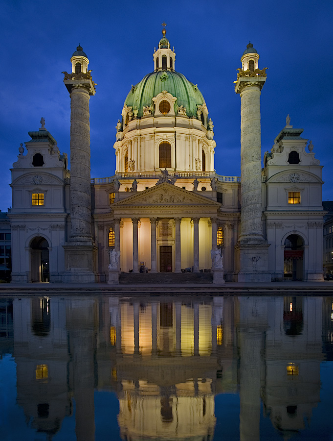 Very appealing colours, i guess the time for taking the image was choosen on purpose? Still some light in the sky, but dark enough to have a nicely illuminated facade. I especiallly like the center part of the image - the entrance and its reflection on the water.